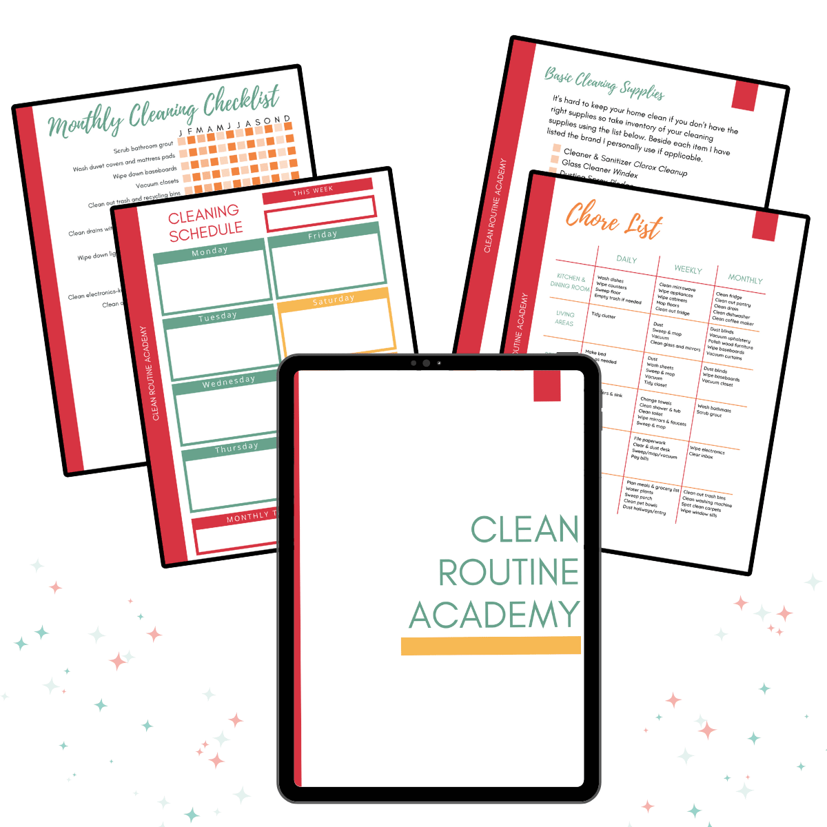 Clean Routine Academy is a comprehensive, step-by-step guide to help you gain control over the chaos in your home once and for all. This 55+ page workbook walks you step-by-step through the process of streamlining your home cleaning routine and making it automatic so you never feel overwhelmed again. It includes checklists, schedules, cleaning tutorials, cheatsheets, and more.
